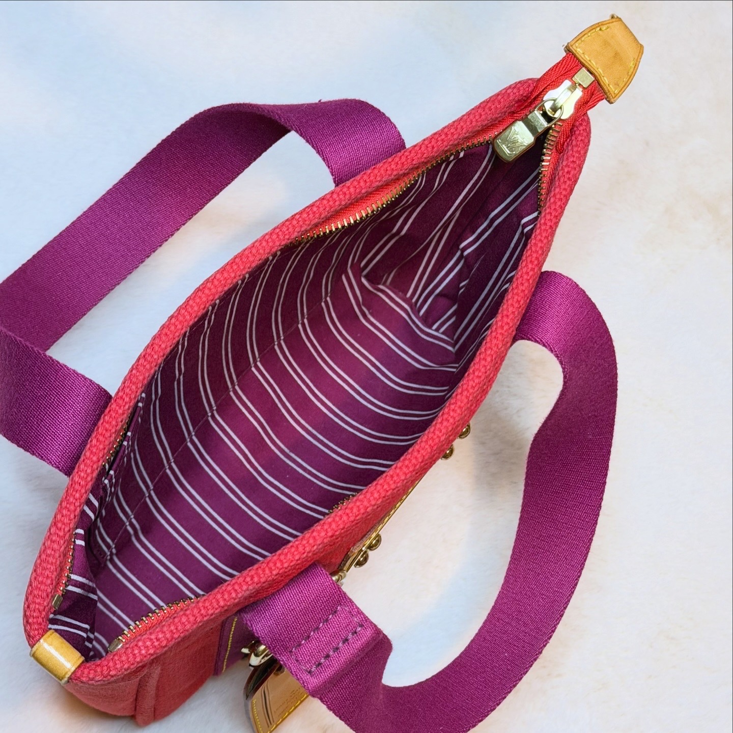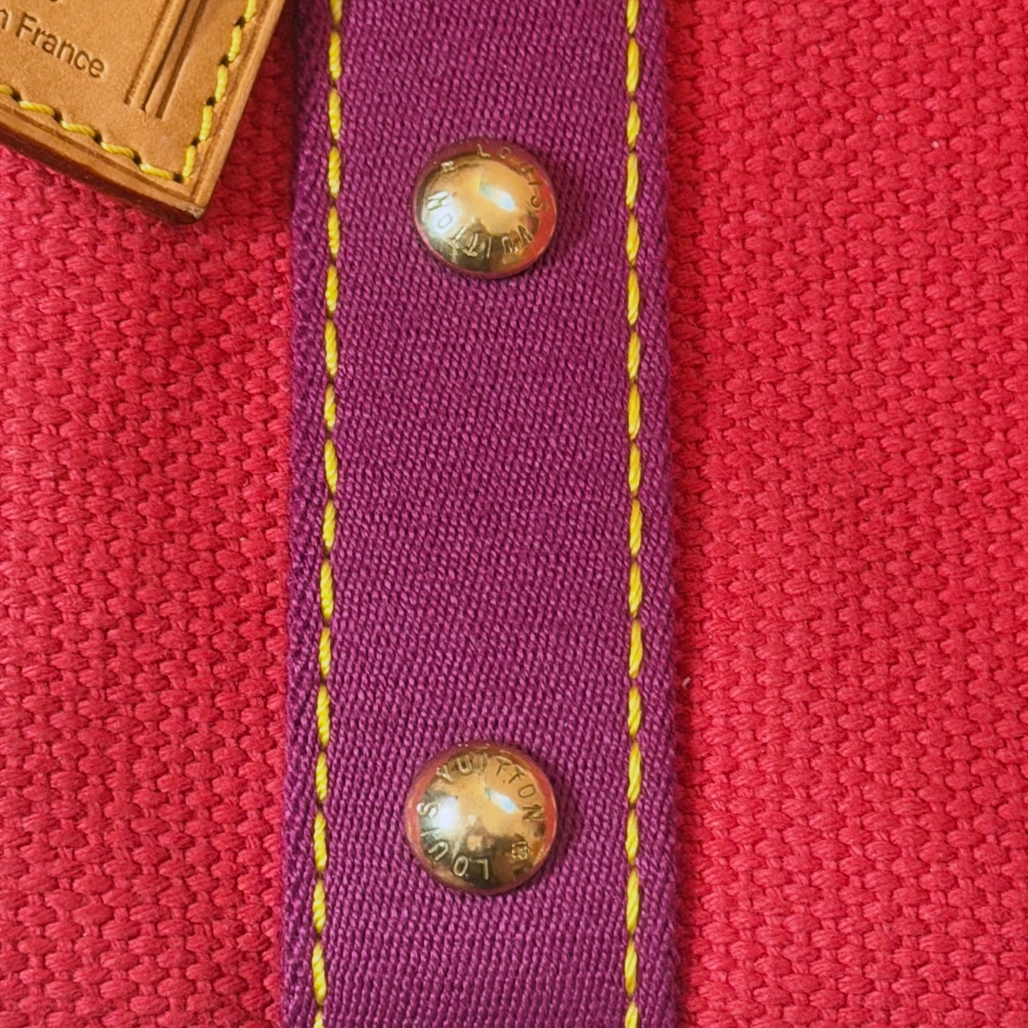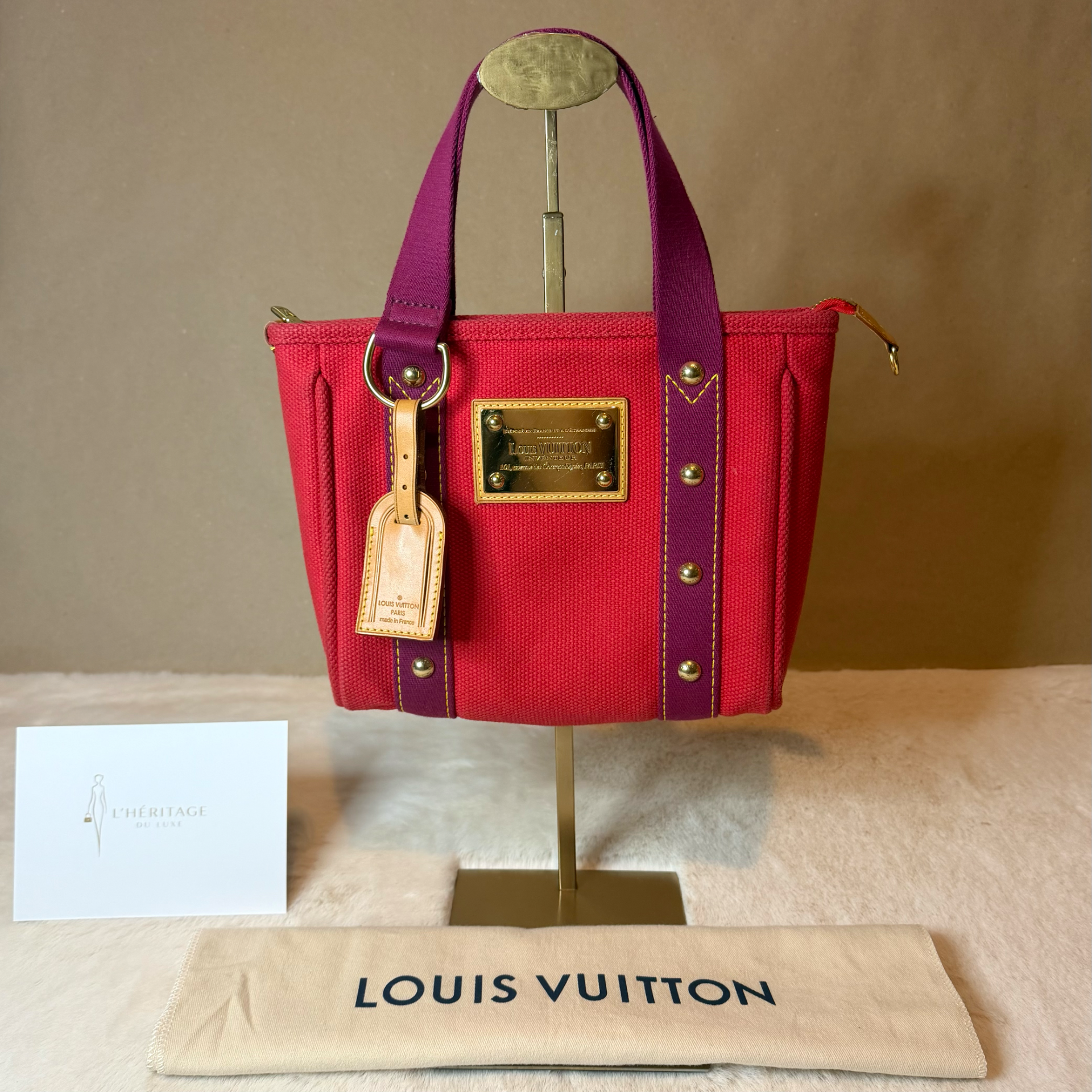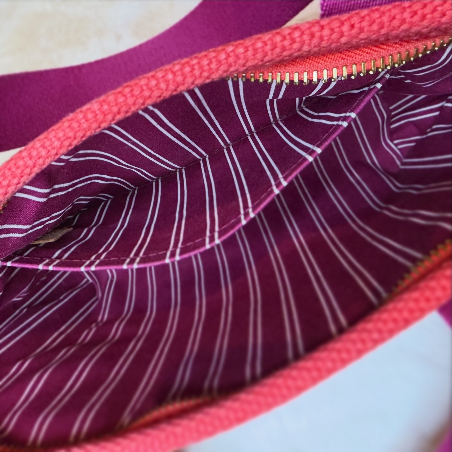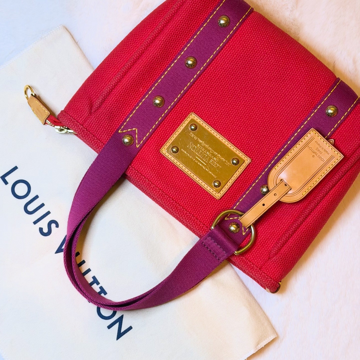 A Tote Bag mais bonita desta estação. Feita de lona em cores vermelho vibrante com detalhes e alças em tons de roxo/cerise. Por dentro é algodão resistente e contém um slip pocket no seu interior.